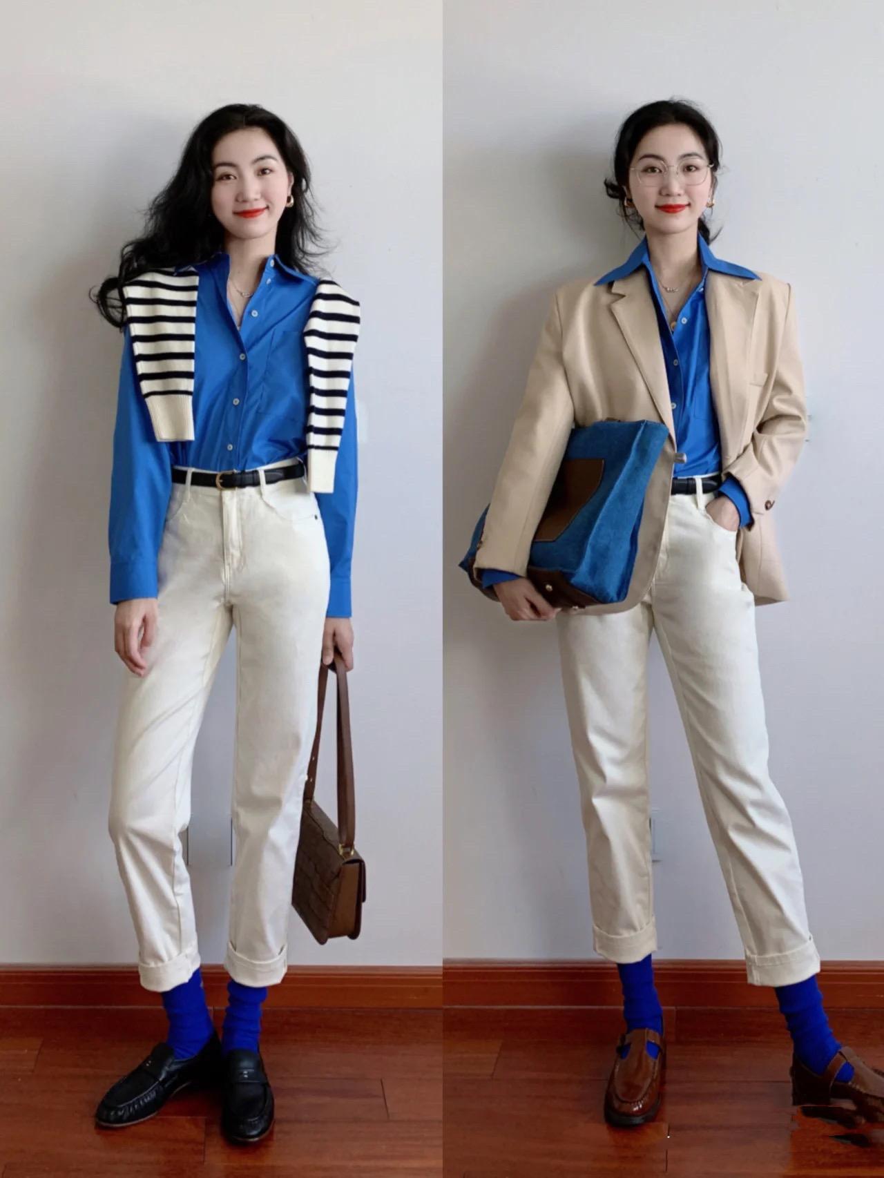 尤其是高飽和度的克萊因藍,雖然亮度也很高,但一點都不會顯得皮膚暗淡無光。高亮度高飽和度的克萊因藍顯白又醒目。克萊因藍的襯衫,配同色系中筒襪,很時尚。
