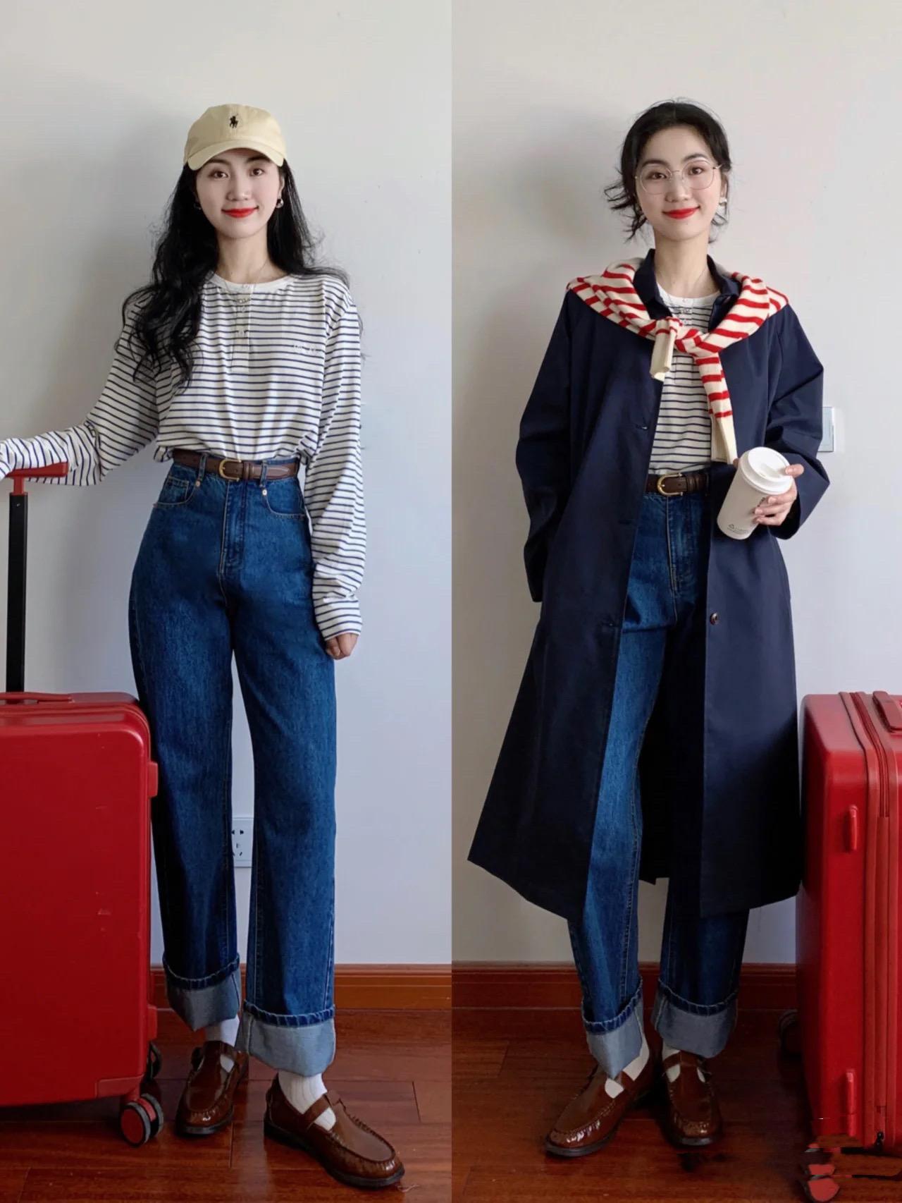比如黑白條紋的打底衫,在秋天裏穿起來就休閒又減齡。有條紋打底衫配藍色牛仔褲,利落還顯腿長,搭風衣外套更具時髦範。