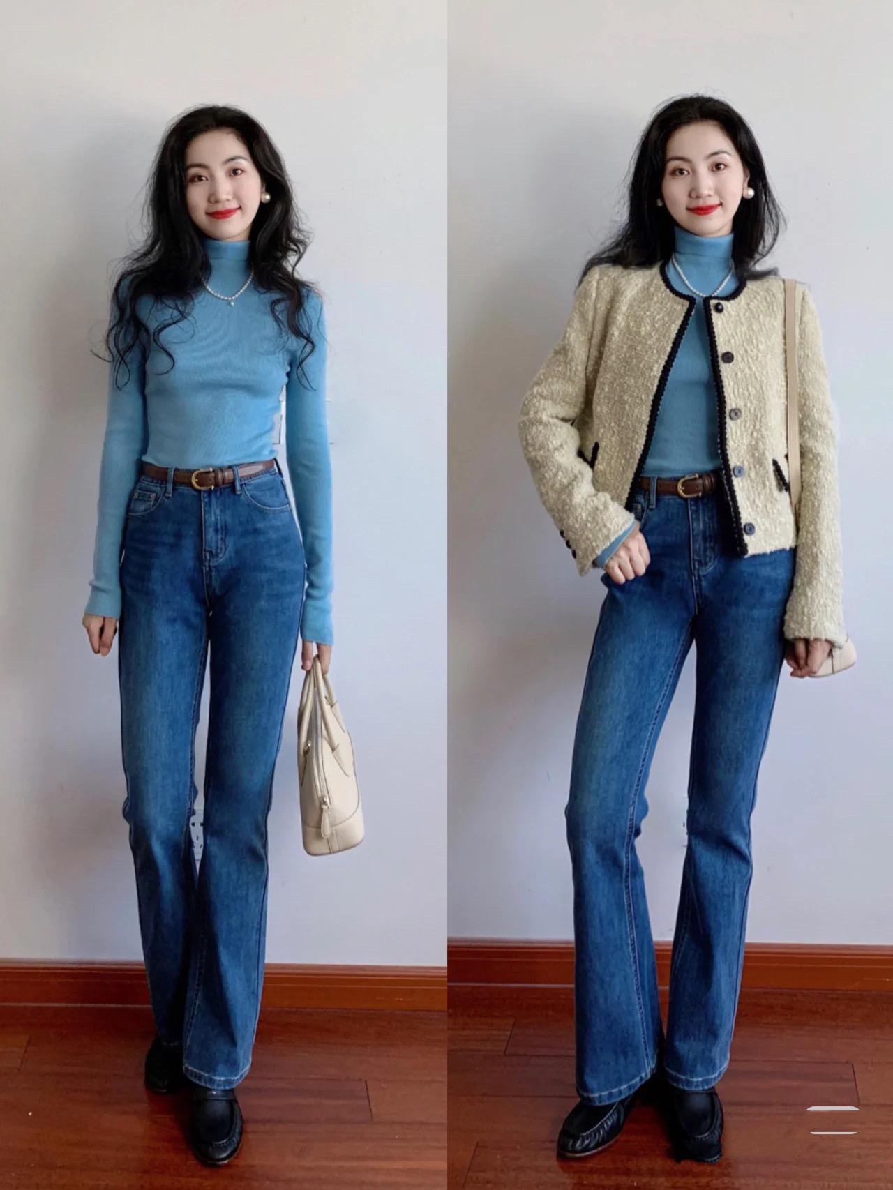用孔雀藍的打底衫來搭配深藍色的牛仔褲,這種內搭順色的組合方式也比較利落顯高。線條的流暢剪裁,營造出更挺拔的身材,以及更優越的比例。