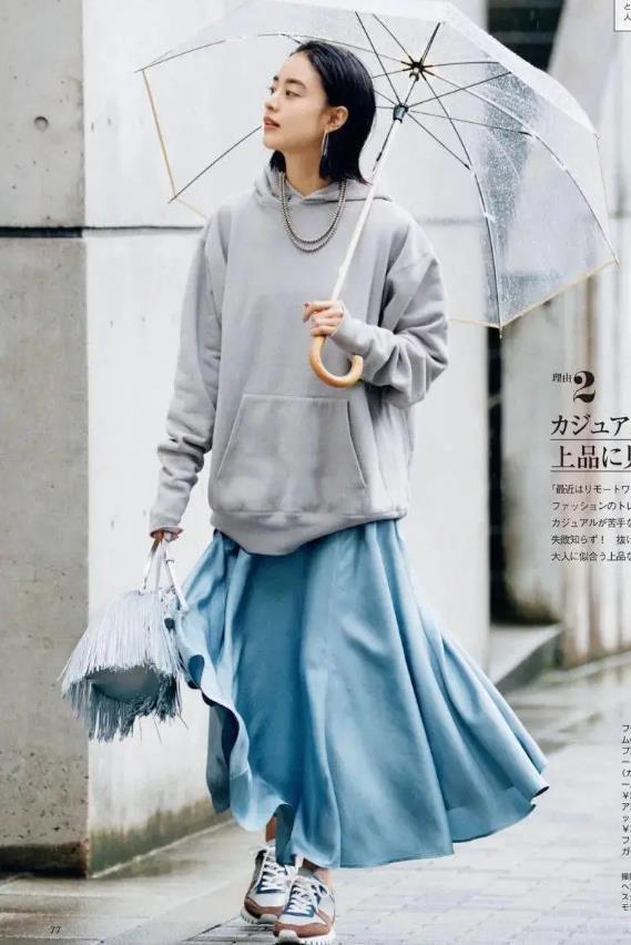 灰色的連帽衛衣,那真的是自帶休閒氣息和百搭的,況且,這個色調也是最容易穿出高級感的,搭配一條藍色半身長裙,藍+白的配色組合,也太時髦和洋氣了。出門再搭配一雙運動鞋,就能展現出自信和氣質,將高級感展現得淋漓盡致。