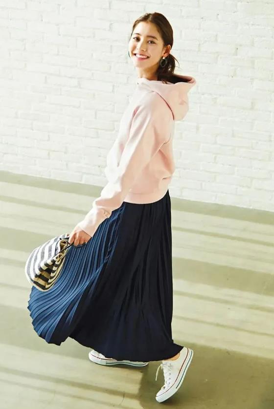 今年粉色系的單品,可是非常流行呢,淺淺的粉色連帽衛衣,這種低飽和度的配色,也太襯膚色了,黃黑皮的姐妹們都可以駕馭,選擇一條黑色百褶半裙來配,瞬間就打造了利落的既視感,任何場合都可以駕馭,腳下一雙白色鞋子,又多了幾分休閒的氣息,很舒適自在。