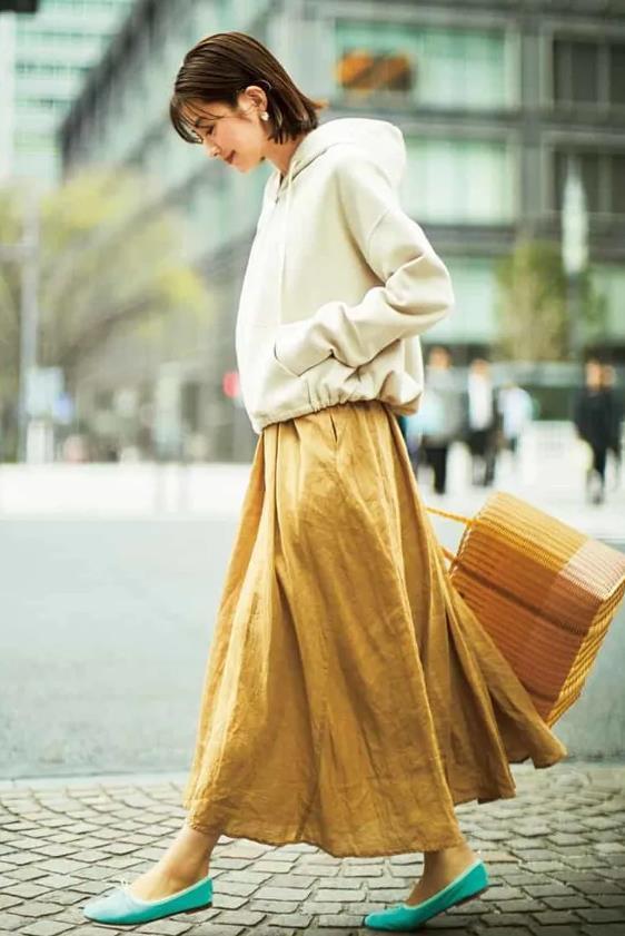 白色的衛衣,很顯乾淨和百搭,這個色調完全不挑膚色的,想要讓整個着裝呈現出明豔動人的效果,可以搭配一條黃色的半裙,整個着裝看起來有些鬆弛和隨性。輕鬆穿出自信和大方,再搭配一雙藍色平底鞋,就能將女人的鬆弛感呈現出來。