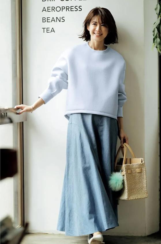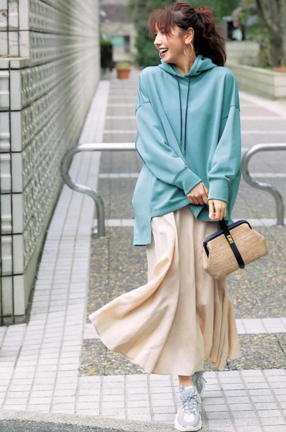 藍色和粉色的配色組合,也太養眼洋氣了,淺淺的藍色連帽衛衣,寬鬆的版型,可太修飾身材比例了,很藏肉顯瘦。選擇一條藕粉色半身長裙來配,這種粉嫩的顏色,很減齡和顯嫩,恰到好處展現出女性的魅力。結合一雙老爹運動鞋,又穿出休閒氣息。