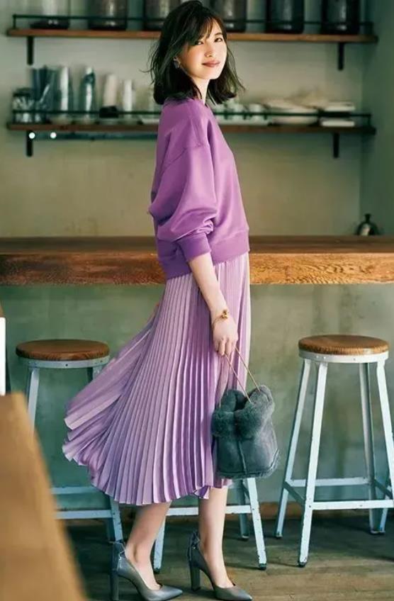 一身紫色系的搭配,感覺對於不懂配色的姐妹來說,是沒有一點違和感的,紫色衛衣配紫色百褶半身裙,由內而外散發出女性的大方和魅力。不管是在什麼時候,都能將大女人的氣質展現出來,腳下再踩着一雙高跟鞋,很是優雅和氣質,盡顯女性的獨立和自信。