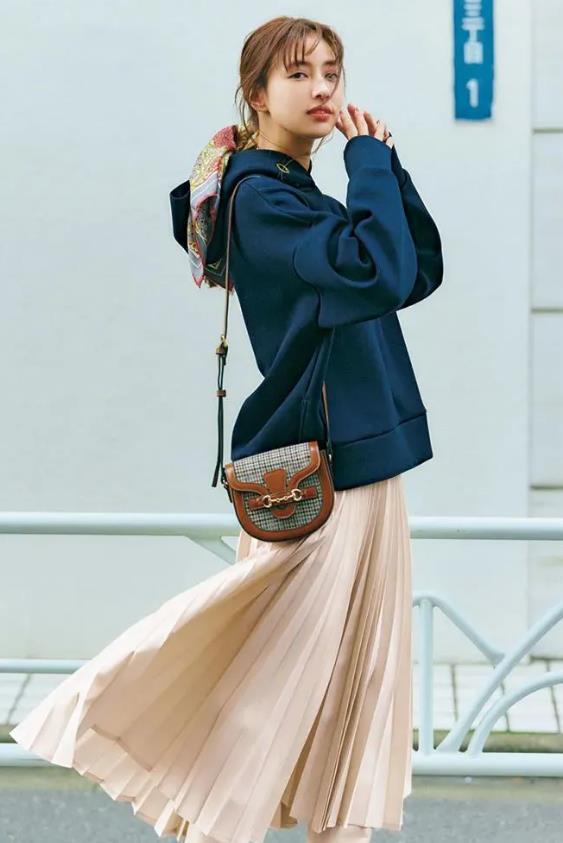 藏藍色的連帽衛衣,這個色調可是很百搭時髦呢,寬鬆的版型,穿得舒適自在又顯瘦,下身搭配一條藕粉色半裙,這樣的穿搭可是很符合現代女性們的着裝要求,有種柔美卻不失氣質感,毫不費力就可以穿出時髦氣質,頭上的絲巾點綴,將女性的東方雅緻呈現出來,清新又自然。