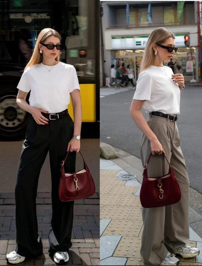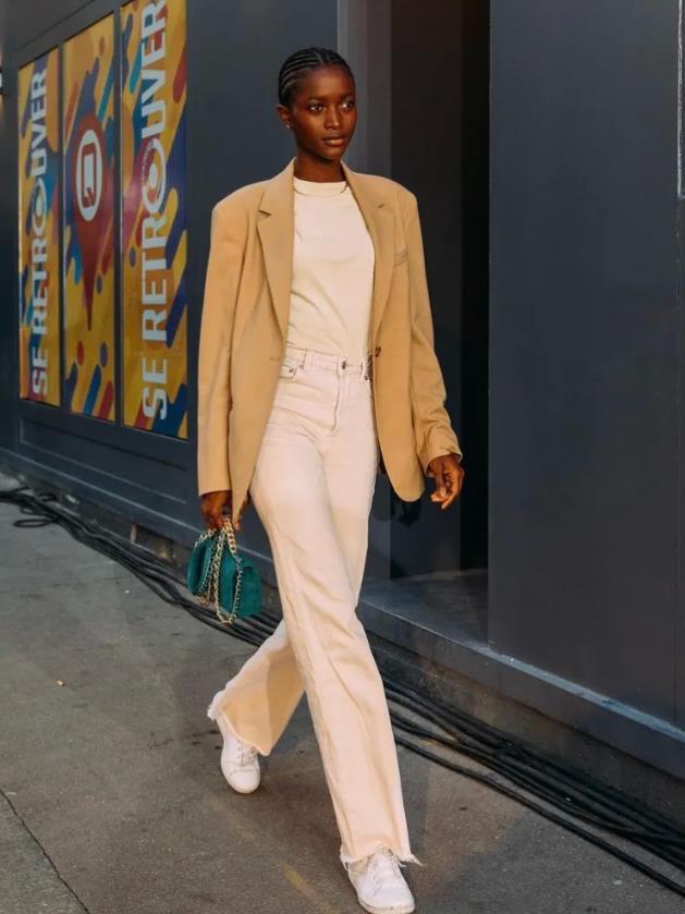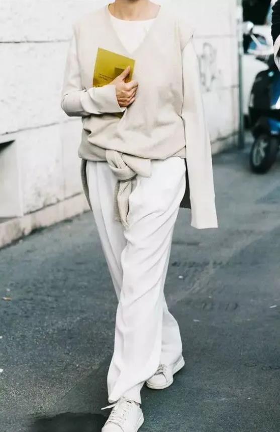 想必誰也不喜歡太拖沓的穿搭吧?如果你選擇了一條拖地的褲子,那麼可以通過配色來提高整體高級感,白色、卡其色這些同色的搭配,都是自帶乾淨和優雅的。