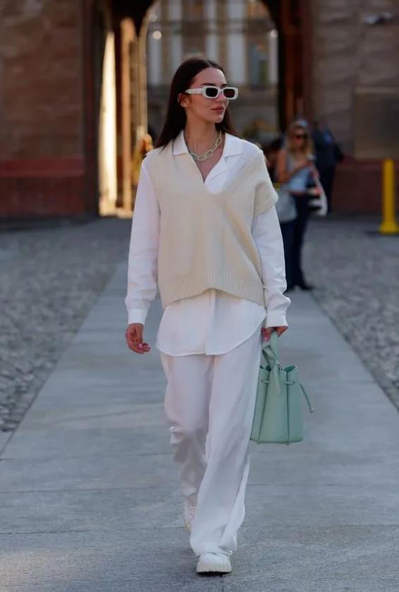 闊腿褲配運動鞋,這樣的搭配讓你的步伐也帶風,隨意又多了幾分休閒舒適感,白色襯衫+毛衣馬甲,疊穿增加層次感,也多了幾分隨性。搭配白色闊腿褲,與襯衫顏色進行了呼應,很和諧大氣。