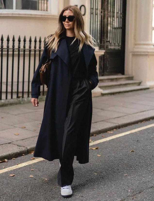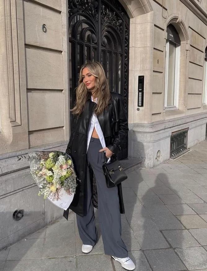秋天,穿闊腿褲一定要配運動鞋,長款黑色皮衣外套+灰色闊腿褲,搭配一雙運動鞋,這樣的配色簡潔大方又高級,整體看起來很隨性自在。