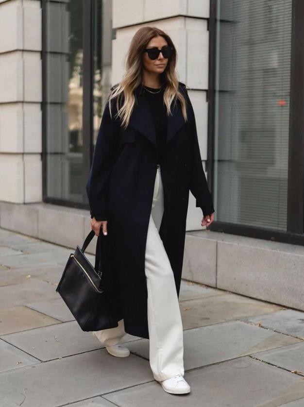 在穿搭上懂得好好利用起配色,是提升時尚度的關鍵,黑色大衣+白色褲子,再加上一雙白色鞋子,很好減弱了黑色大衣的沉悶,多了幾分輕盈,還不失格調。