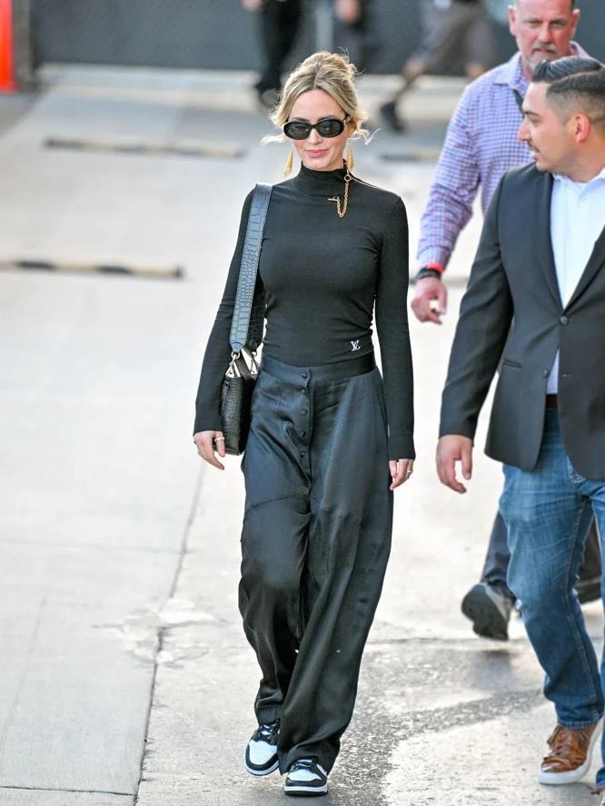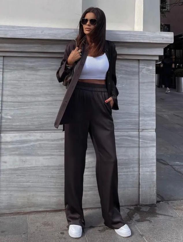 闊腿褲配運動鞋的組合,真的能毫不費力就穿出高級感,很簡單舒適自在,黑色西裝闊腿褲,垂墜感極佳的,能將腿部線條給拉得很修長。可以在腰間增加一條腰帶點綴,修飾身材的同時,還提高腰線比例。