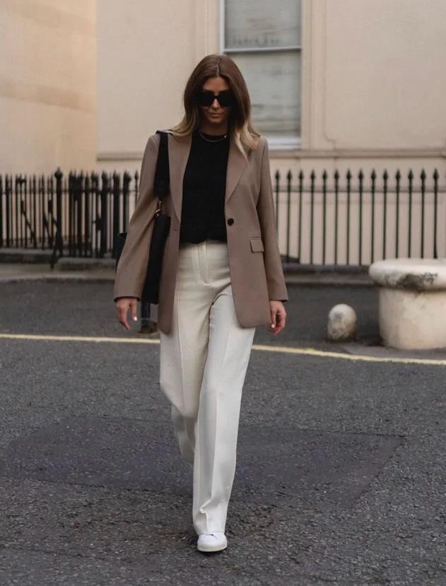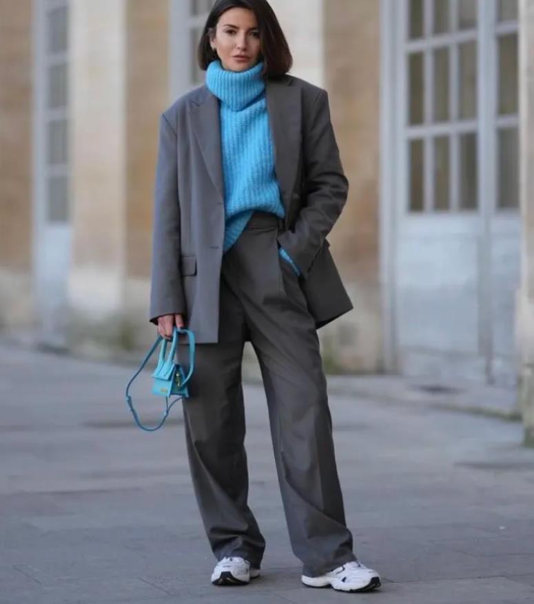 西裝與闊腿褲的組合,經典大方又時尚,你可以試着混搭牛仔褲或運動闊腿褲,選擇不同的褲子來配,所呈現出來的風格也是不一樣的。