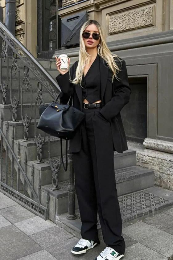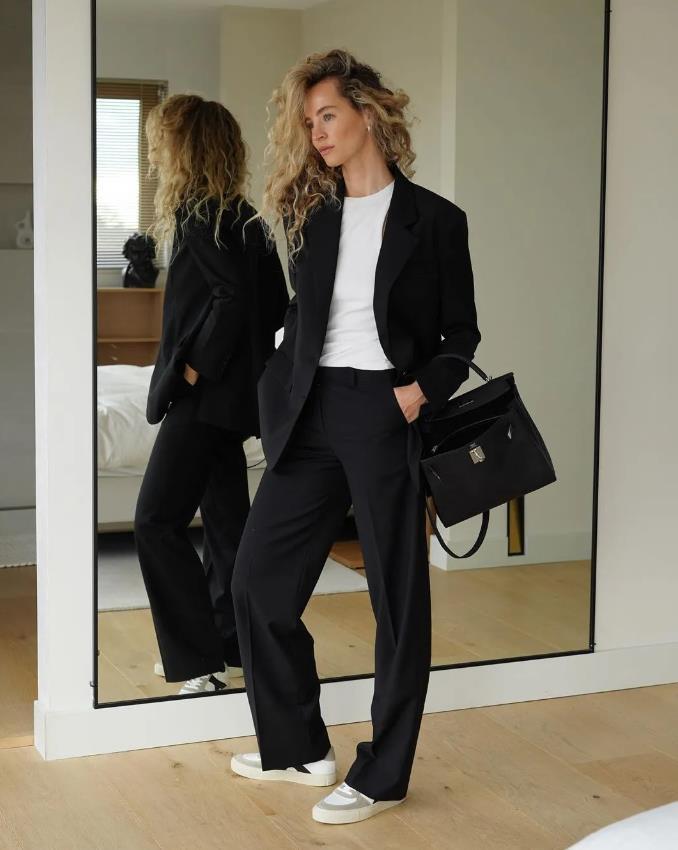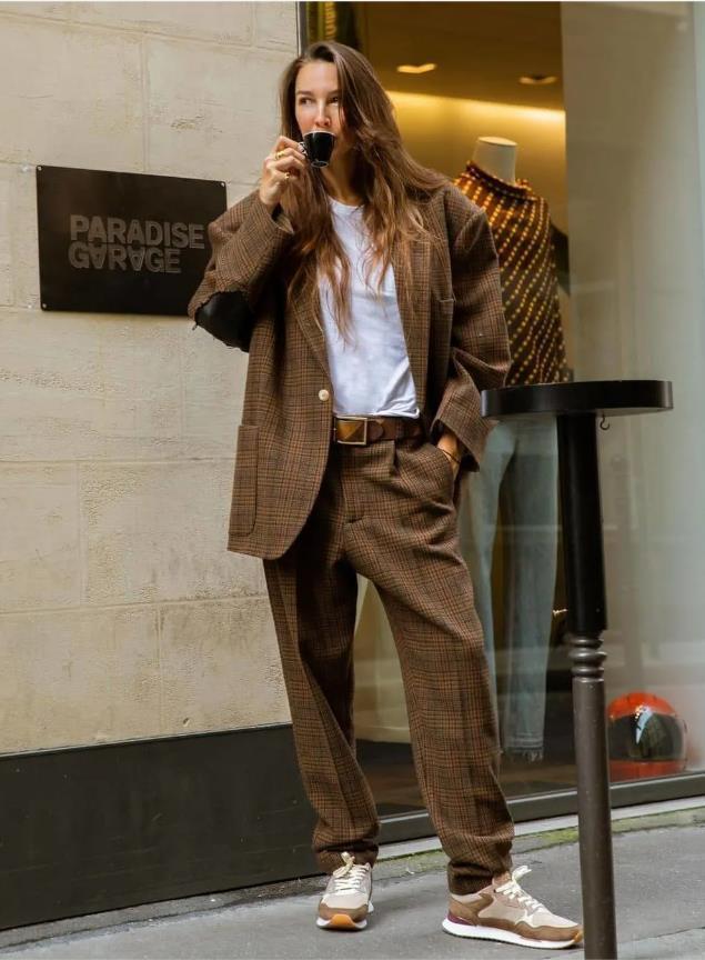 有時候,就算是最簡單的基礎款,也是能穿得很時尚呢,西裝套裝+運動鞋混搭,運動鞋的加入,不僅減弱了西裝的嚴謹,還爲整個着裝增加了幾分休閒和舒適感。