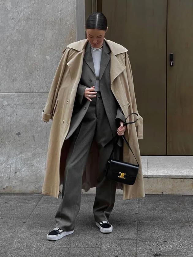 灰色套裝+卡其色風衣,這樣的疊穿打扮,最適合秋冬季節的了,不僅有大女人風範,還不失氣質。