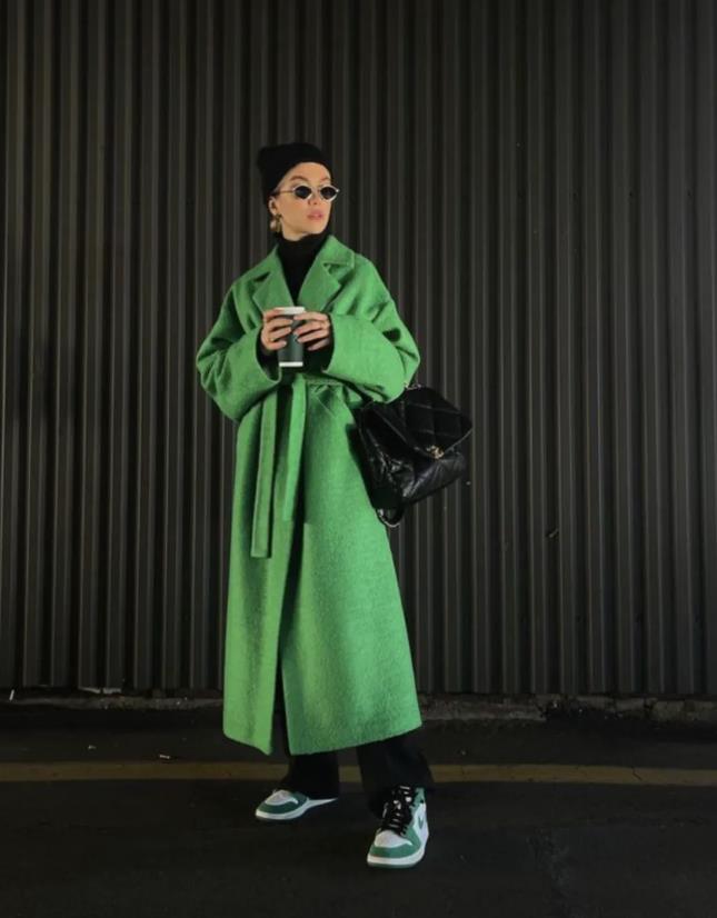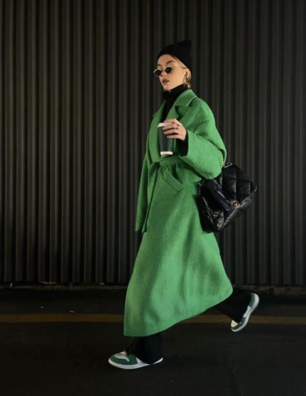 綠色的大衣配綠色運動鞋,色彩呼應,讓整個穿搭看起來都很和諧,讓人在視覺上呈現出一種清新的氣息。這麼明亮的色調,應對沉悶的秋冬季節是很不錯的,超級吸睛的。