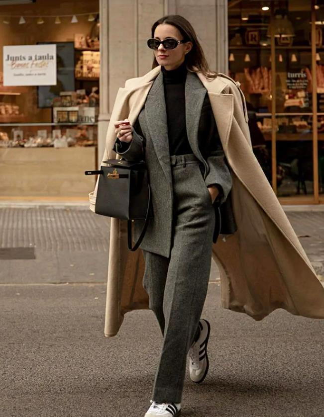 到了比較寒冷的季節,就選擇外套+外套的疊穿吧,灰色西裝套裝+卡其色大衣,輕鬆就塑造出高級精英範,整體看起來簡約卻不失大方,再搭配一雙運動鞋,就非常容易塑造出休閒氣息,大衣就直接披在肩上,整個人的氣場就全開了。