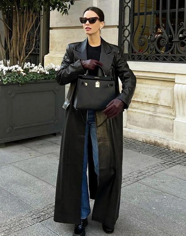 誰說大衣只能選擇毛呢和羊絨材質的呢?你也可以試試皮質的大衣,像這種經典黑色皮大衣,穿起來也太颯了,自帶酷感的,特別是這種長度過膝的皮大衣,敞開來穿,加上寬鬆的版型,可太藏肉顯瘦了,搭配一條藍色牛仔闊腿褲,休閒且不失高級,腳下踩着一雙黑色樂福鞋,又多了幾分舒適感。