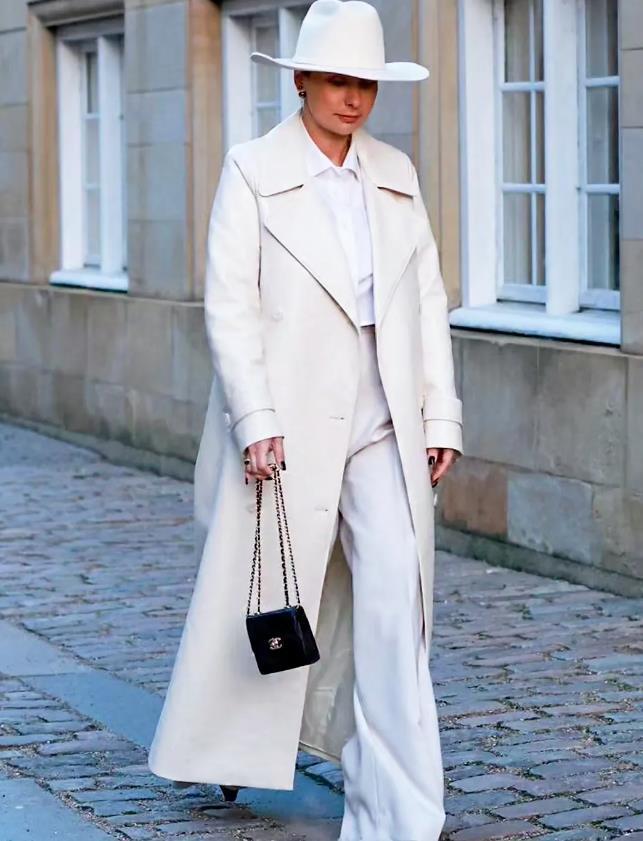 若是你覺得黑色西裝大衣穿起來很沉悶,那麼可以嘗試一下白色西裝大衣,內搭選擇一件白色襯衫,增加了造型和諧度,也不失瀟灑自在。對於不懂配色組合的姐妹們,選擇這樣的顏色搭配是永不出錯的,下身搭配一條白色西裝闊腿褲,剛柔並濟,給人一種和高級的範。