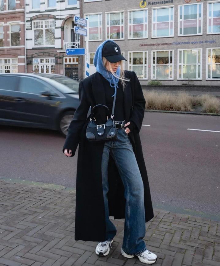經典黑色長大衣,真的是太時髦和耐看了,寬鬆的版型,不管是什麼身材都能駕馭的,過膝的長度,最容易打造出強大氣場了。內搭黑色打底衫,這樣視覺上看起來就更顯瘦了,搭配一條牛仔闊腿褲,鞋子是白色運動鞋,可顯舒適和自在了。