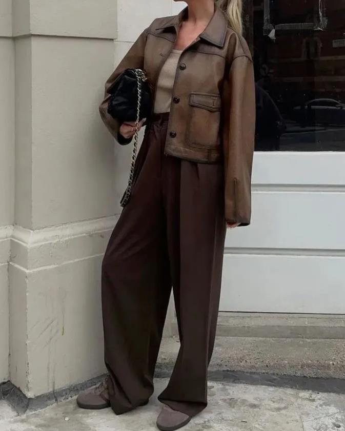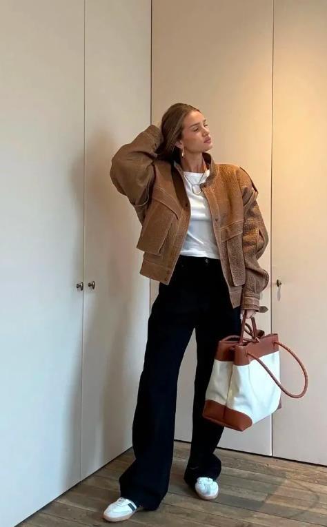 喜歡穿出帥氣風的姐妹們,可以試試短款夾克外套,搭配闊腿褲和運動鞋,整體造型的風格就多了幾分休閒和隨性。