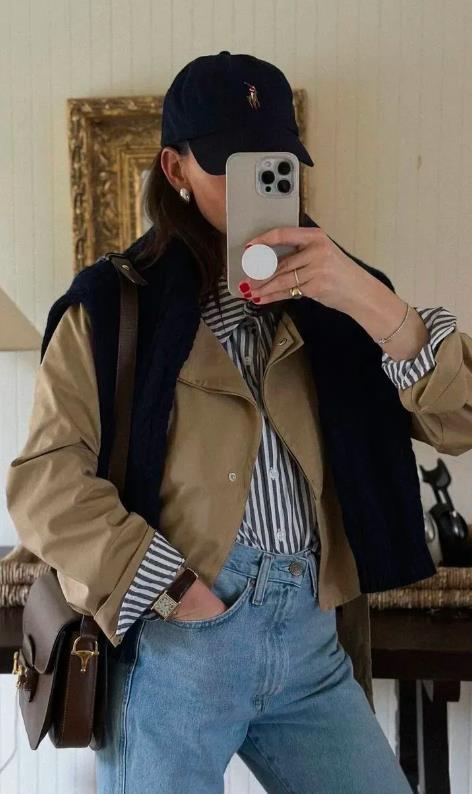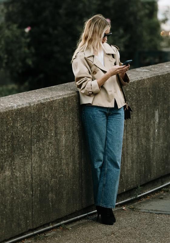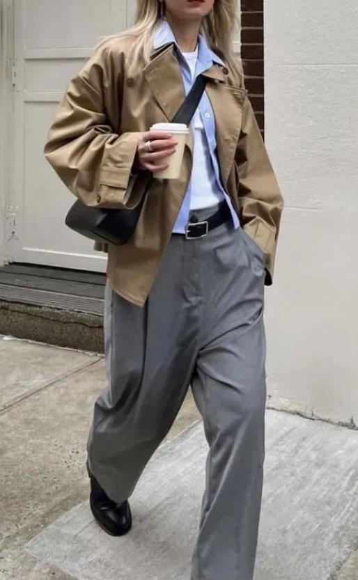 短款風衣+挺括的西裝褲,整個造型看起來簡約又利落,當然了,也非常有魅力。風衣外套裏面可以進行疊穿,白色t恤+藍色襯衫,增加層次感又時尚。