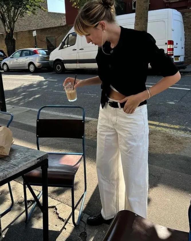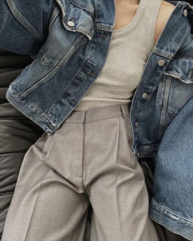 牛仔短外套,總是能帶給人一種隨性和青春的氣息,搭配起高腰闊腿褲,不僅提高了腰線,還拉長腿部線條,營造出一種自在隨性的範。