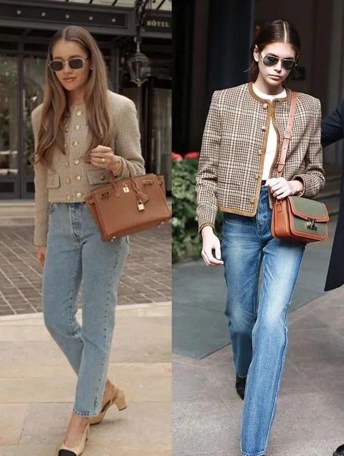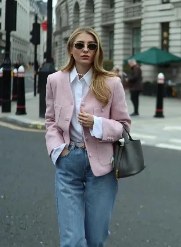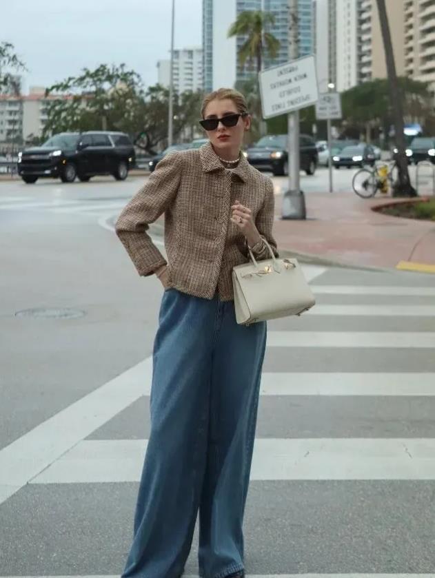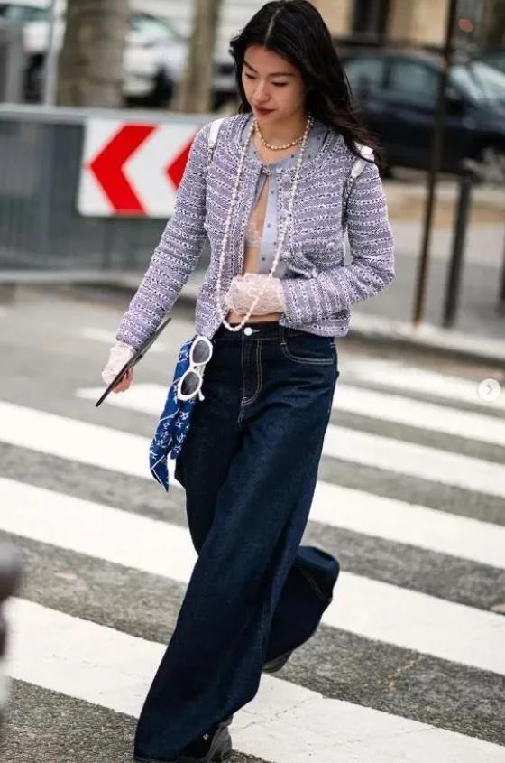 牛仔藍的闊腿褲,是非常百搭的,不管與什麼顏色的小香風外套相配,都能完美演繹出時尚氣息,當然了,配牛仔藍色闊腿褲,整個風格看起來就很清爽。