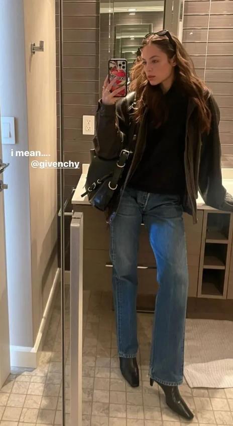 皮革材質的外套,是很顯帥氣和個性的,寬鬆版型的短款皮革外套,搭配藍色牛仔褲,這樣的搭配,不管是上班還是日常休閒,都能輕鬆應對,讓你時時刻刻都很有魅力。