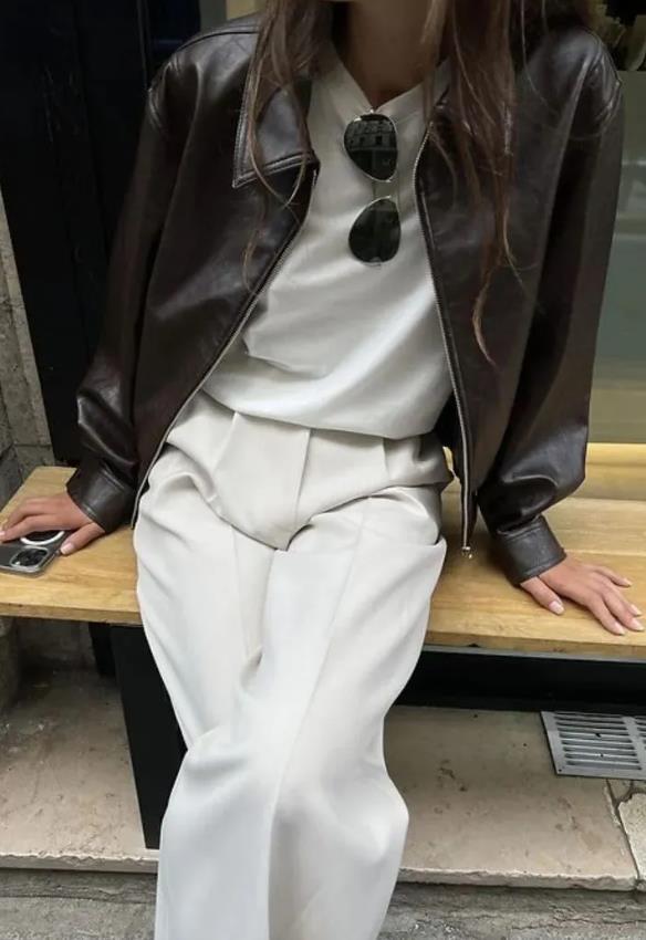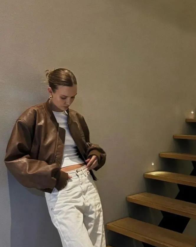 這個秋天,給自己選擇一件皮革外套,內搭白色上衣和白色闊腿褲,這樣的搭配看起來很簡潔大方,也不失氣場,每走一步都散發着優雅和氣質。