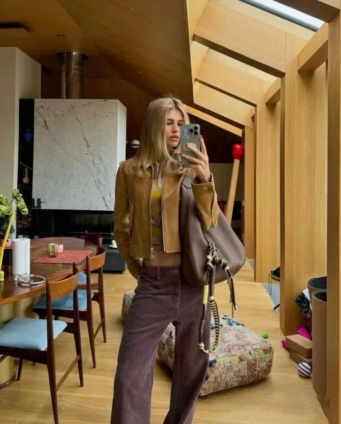 棕色的皮革外套,自帶復古氣息,這樣款式的外套自帶濃厚的搖滾風情,下裝可以搭配一條休閒西裝褲,整體看起來隨性自在又有範。