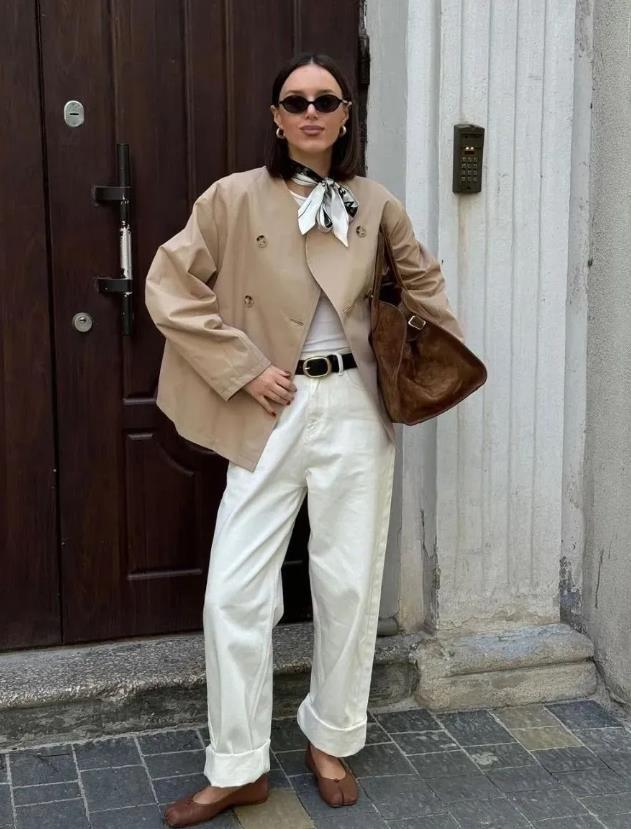 每個人都可以找尋到屬於自己的穿着風格,短款夾克外套,是專屬於個矮女性的最佳選擇,在春秋季節就可以穿起來,搭配白色闊腿褲,利用一條絲巾進行點綴修飾,精緻還不失大方。