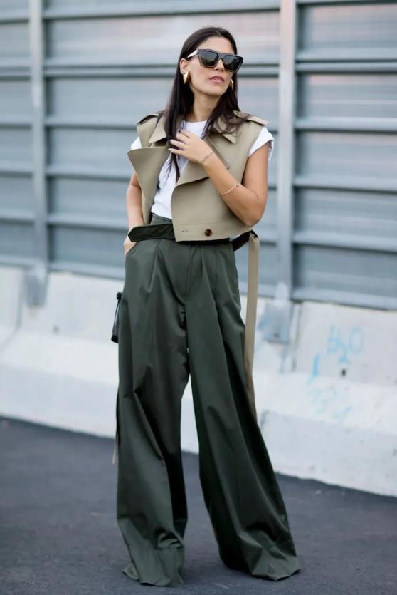 就算是秋天,也可以適當進行露膚,短款風衣外套,今年很流行呢,短款風衣馬甲,你嘗試過嗎?疊穿白色t恤後,整體看起來就頗顯層次感,配上同色的拖地闊腿褲,高腰的設計,巧妙將腿部線條給拉長了不少。