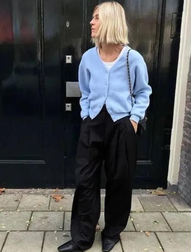 短款針織開衫配西裝闊腿褲,鬆緊結合,實在是太顯隨性了,低飽和度的藍色,很襯膚色和顯白,裏面疊穿一件白色t恤,增加層次感又時髦。