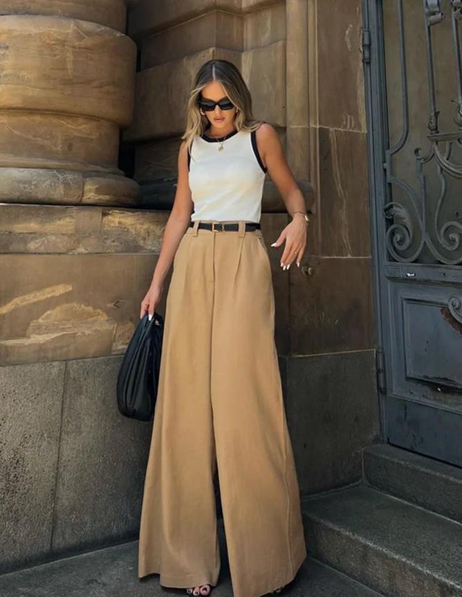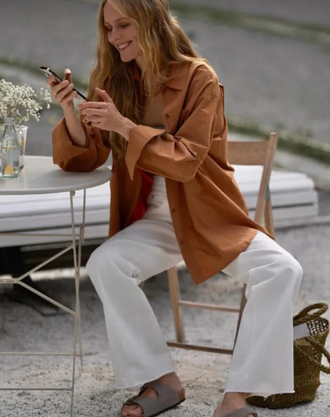 白色闊腿褲,也是今年最火的褲子之一,這種顏色看起來更乾淨出彩,搭配一件焦糖色襯衫,一秒就打造出秋天的氛圍感,整個搭配看起來是那麼自然休閒,鞋子可以配運動鞋,或者是涼鞋都行。