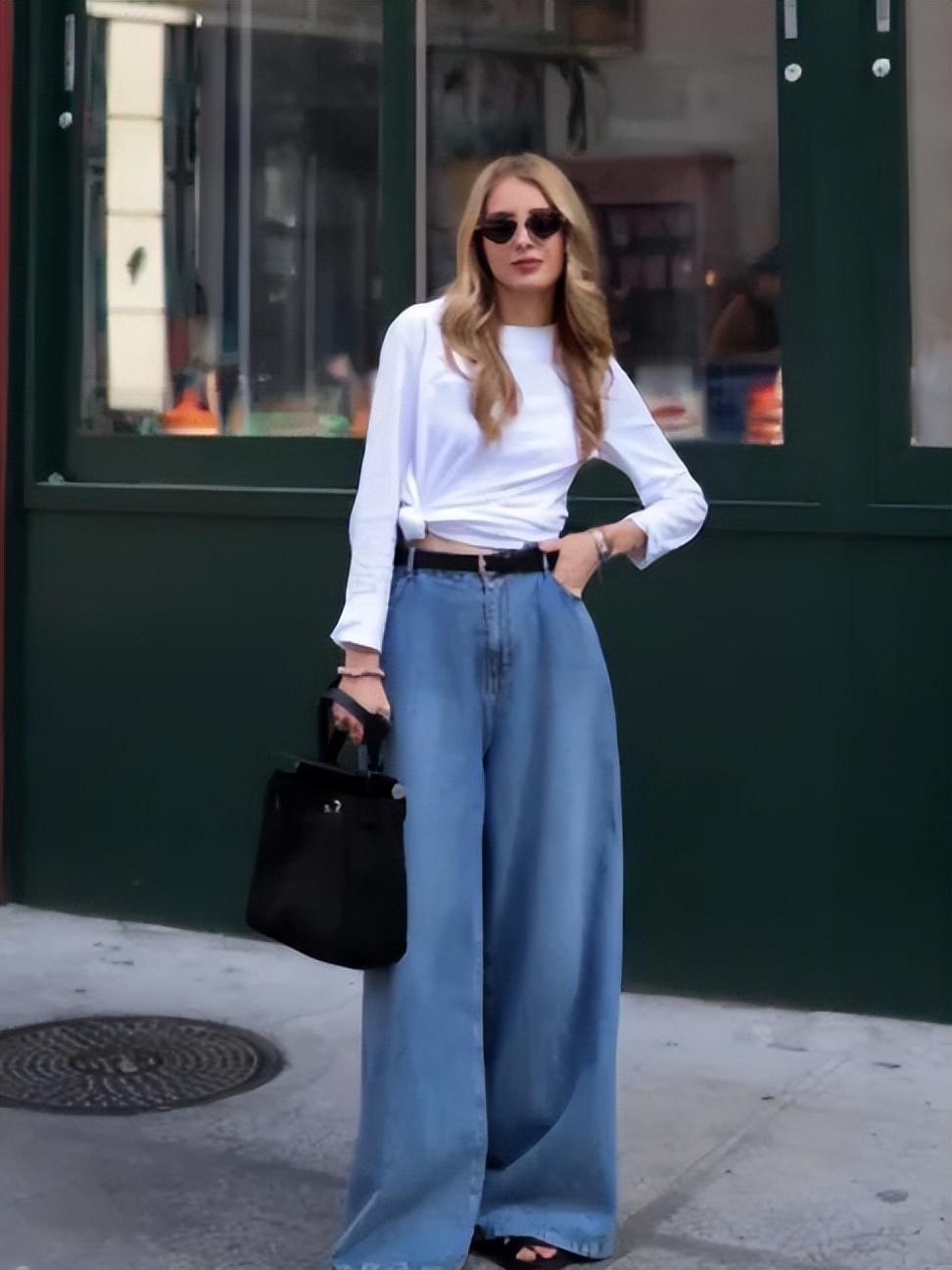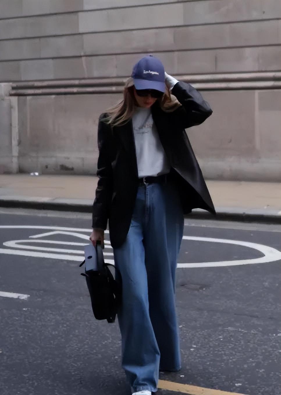 闊腿褲是時尚圈裏永不過時的單品,藍色牛仔闊腿褲+黑色西裝外套,整體看起來精緻卻不失幹練氣質,很好展現出個人的風采,西裝外套裏面配一件印花t恤,這樣的打扮看起來落落大方還不失氣質。
