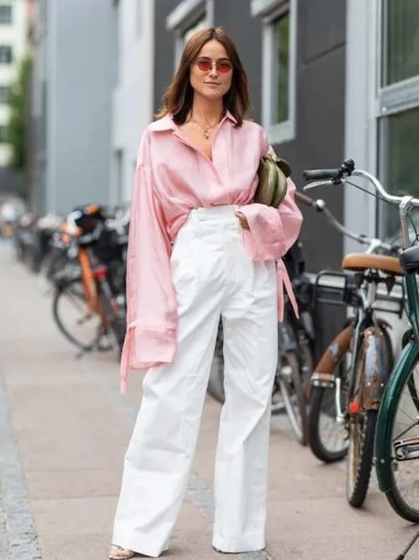 白色高腰闊腿褲,這種顏色的闊腿褲,不僅能穿得很顯瘦,也自帶清爽與乾淨的氣息,上衣搭配了一件粉色襯衫,粉色+白色的配色,實在是太讓人喜歡了,不僅有品味,還不失大氣感,將襯衫的衣角塞進褲子裏面,就顯得很大氣了。