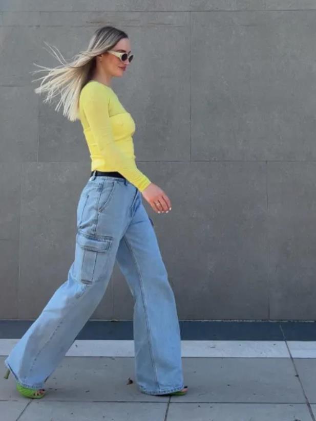 藍色牛仔褲見得比較多了吧?那麼牛仔工裝褲你又見過沒?這條牛仔褲的款式是偏向工裝褲款式的,穿起來既不失帥氣,還很顯年輕和活力。上衣配一件黃色打底衫,整個人瞧着明豔動人,搭配一雙綠色高跟鞋,瞧着就非常個性,還很搶眼。