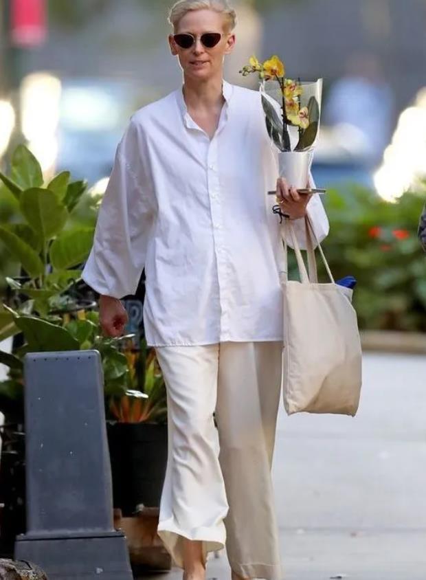 喜歡一身乾淨的白色穿搭,白色闊腿褲+白色襯衫,同色系的組合,自帶高級感,上下都是寬鬆的版型,對身材一點違和感都沒有。初秋,這樣穿時髦又不失清爽,至於鞋子可以配涼鞋,或者是運動鞋都是很不錯的。