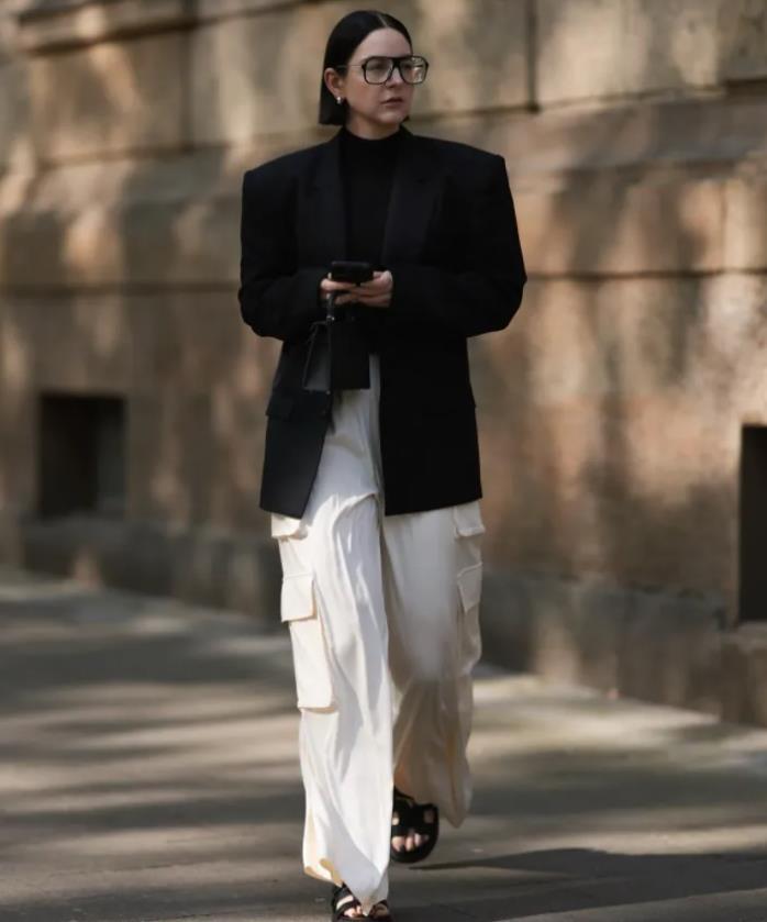 工裝褲可是很容易打造出帥氣感的,白色工裝褲配黑色西裝外套,很經典時尚的配色組合,原本嚴謹的西裝,也因爲結合起工裝褲,從而多了幾分帥氣感,優雅又不失獨立氣息,內搭黑色打底衫,讓你穿得鬆弛又不失大女人風。