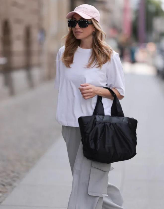 還有灰色的工裝褲,也是很百搭和耐看的,寬鬆的褲型,感覺什麼腿型都可以包容,選擇一件白色t恤來配,白色+灰色的組合,真的很時髦高級。可以將t恤塞進褲子裏面,這樣就能巧妙拉長腿部線條,輕鬆打造出高挑感,搭配一頂粉色鴨舌帽,青春減齡又不失少女風,