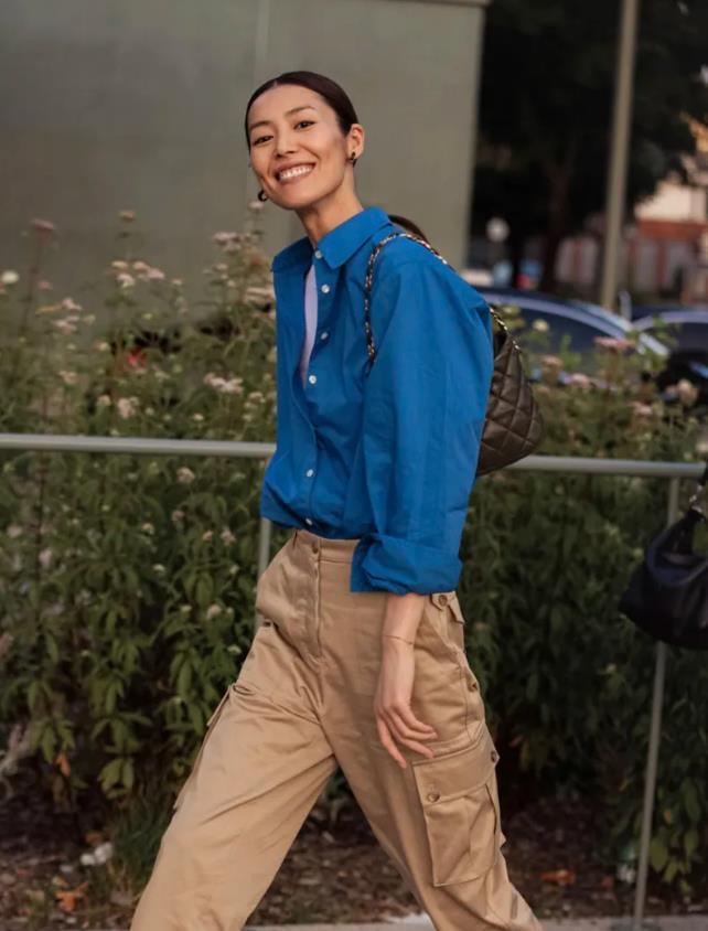 卡其色工裝褲,那真的是自帶酷帥感的,上衣配了一件深藍色襯衫,輕鬆演繹出剛柔並濟的效果,分分鐘提升個人的氣場,襯衫裏面還可以選一件白色t恤,增加造型層次感,也讓你的着裝看起來很休閒舒適,記得要把襯衫塞進褲子裏面,這樣就更顯利落和大方了。