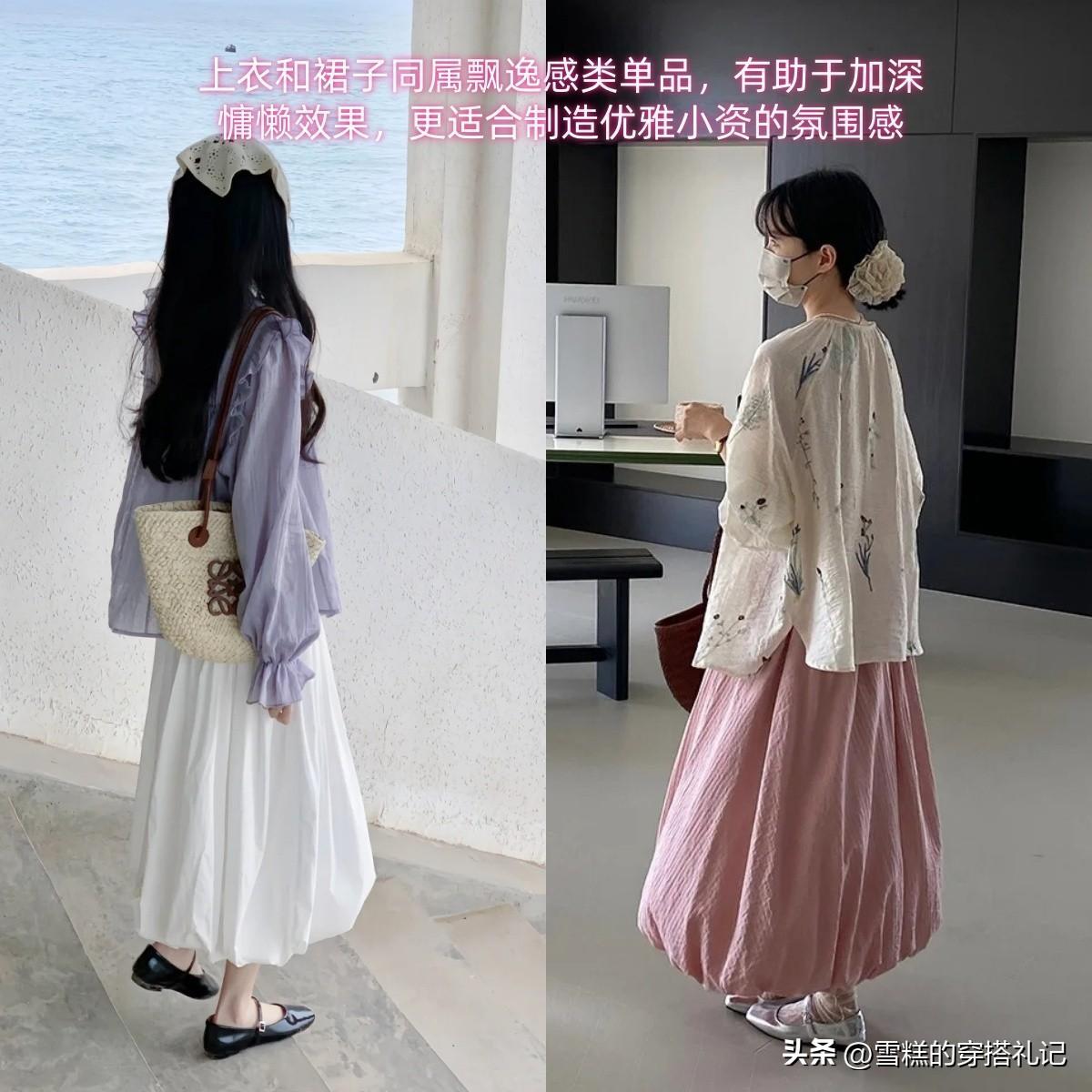 雪紡類的上衣搭配上花苞裙最是有仙女感。薄而不透的上衣最適合氣溫偏高的夏末初秋,即使是寬大的版型也照樣沒有膨脹感。而與鬆緊相交的花苞裙一結合,最是優雅得體了。