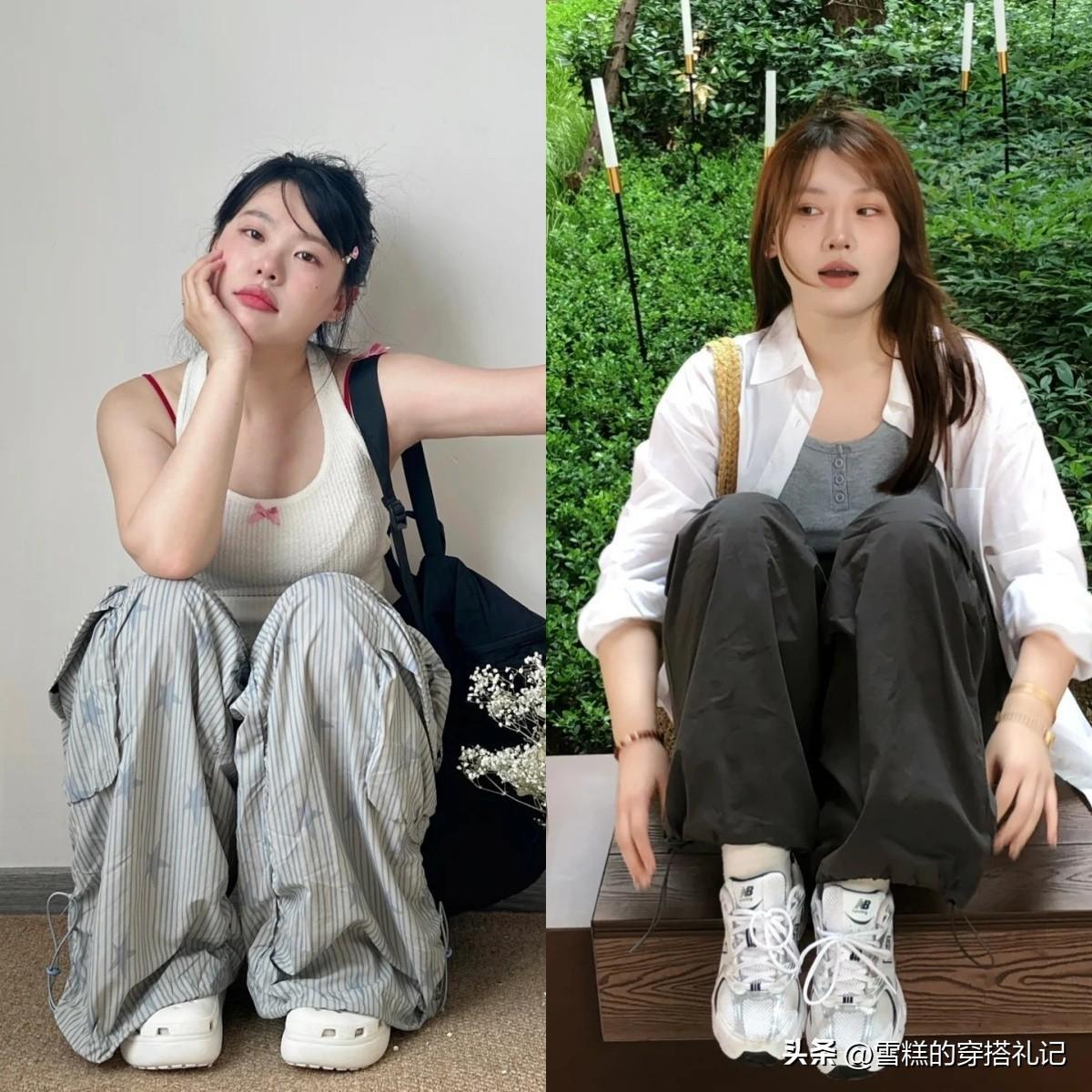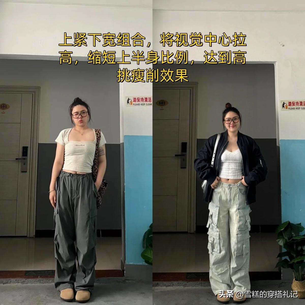 咱們微胖女人經常在意自己的腿型肉多線條還不夠直,因此常常拿帶有垂墜感的褲子幫助延長縱向的視覺感。這個時候準備一條工裝褲就很有必要,它的大範圍包裹感,遮肉效果可以說和闊腿褲不相上下。