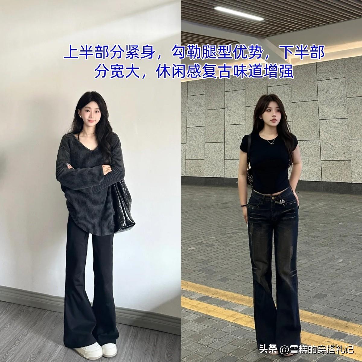 第二種希望大家get的下裝,就是充斥摩登復古味道的微喇褲。它從臀胯部到膝蓋之間的修身感恰好勾勒得咱們腿型玲瓏有致,而在小腿肚以下的放寬效果又彰顯了視覺上該有的顯瘦效果。