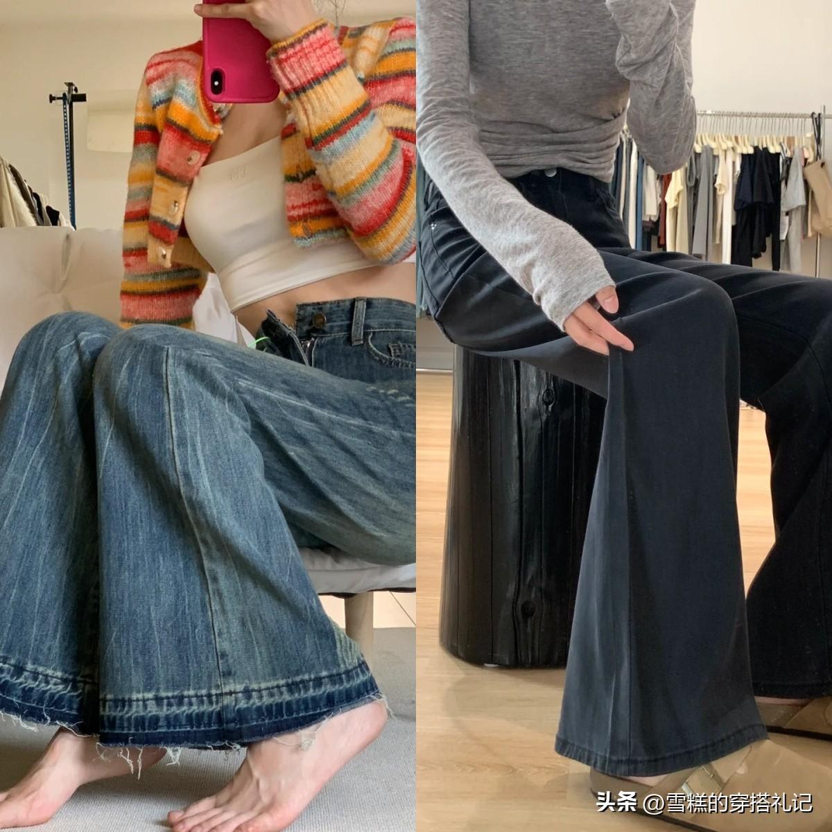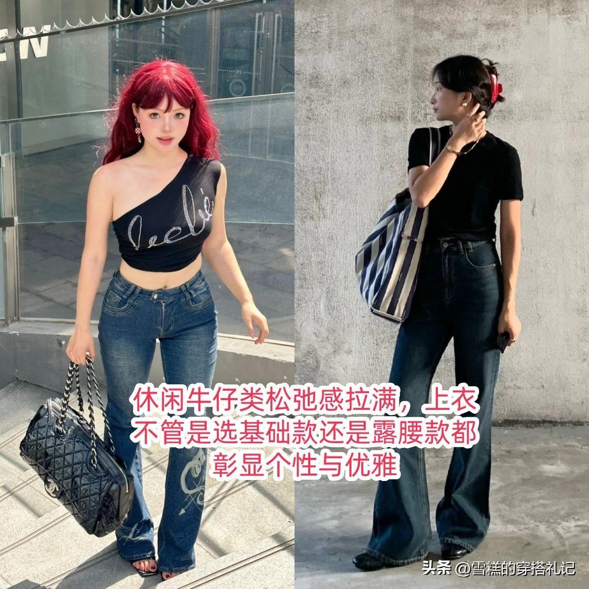 休閒感滿滿的牛仔微喇褲,搭配上深色的修身上衣,給人一種撲面而來的都市麗人感。即使是沒有花紋作爲裝飾,只選用打底衫之類的單品,實際就很有極簡優雅的氣質。