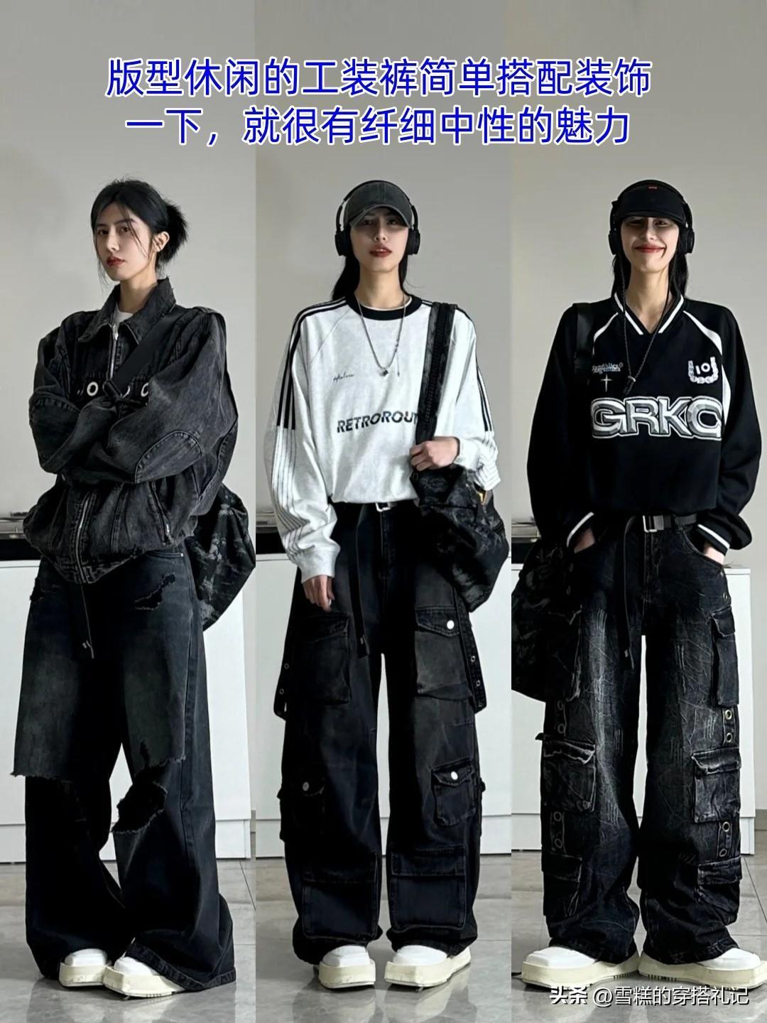 +寬鬆上衣,上寬下寬注意拉高身材比 如果更喜歡寬鬆一些的上衣,那麼在於工裝褲搭配的過程中,建議利用上衣和褲子的色調不同,來區分出上下半身的差別。最關鍵的一點是,根據身材特點來劃分明暗,比如上半身肉感較重,深色的上衣會更顯瘦一些,所以下半身建議選淺色一點單品來提亮整體。當然爲了增加呼應效果與造型設計感,上下單品之間的色彩需要有相同的地方。