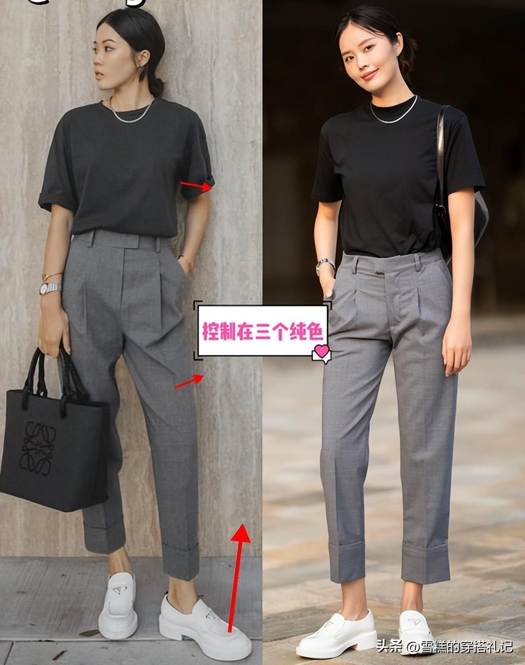 讓褲子的搭配快速融入到自己的穿搭中,其實不需要太多的複雜裝扮。從簡出發即可,尤其是在顏色上的選擇,營造出極簡的配色,更容易突出時尚與檔次。顏色不要超過三種,儘量有深淺的對比,這樣能穿出衣服的層次感,又不會顯得過於突兀。剛掌握穿搭的女人可以嘗試只用基礎的配色,比如黑白灰不容易踩雷,也不用擔心過時。
