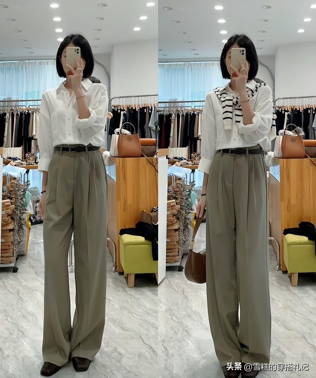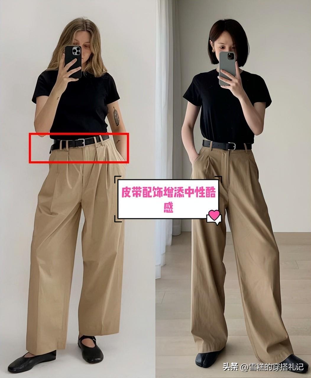 一條正確版型的褲子,應該是從直筒、闊腿展開,想要穿搭顯得利落乾淨,選直筒版型的褲子,它的寬鬆度恰當,褲子本身有着流暢的線條,上身顯得女人利落大氣。若想要更長的腿部,以及顯氣場的高級感,穿闊腿款式準沒錯,它突出女人的高級感,上身有種撲面而來的瀟灑感。