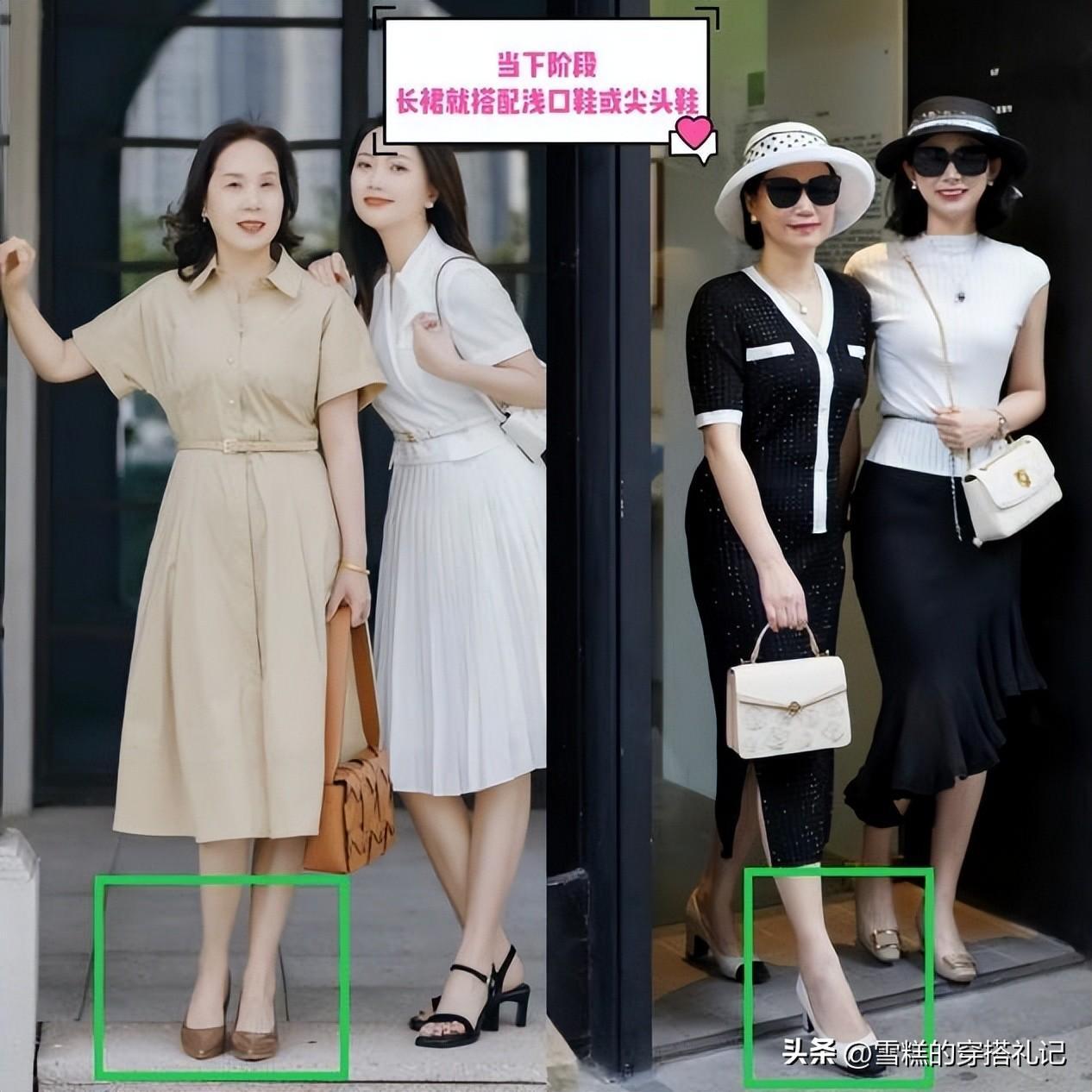 在中年階段的時候,其實與長款的裙裝進行搭配的鞋子更推薦大家既能穿的有氣質襯托效果,又可以對於我們的身材狀態有着絕對的修飾。那麼在這裏推薦大家夏天和秋天這兩個季節,就可以將淺口鞋又或者是尖頭方頭的設計進行優選了。
