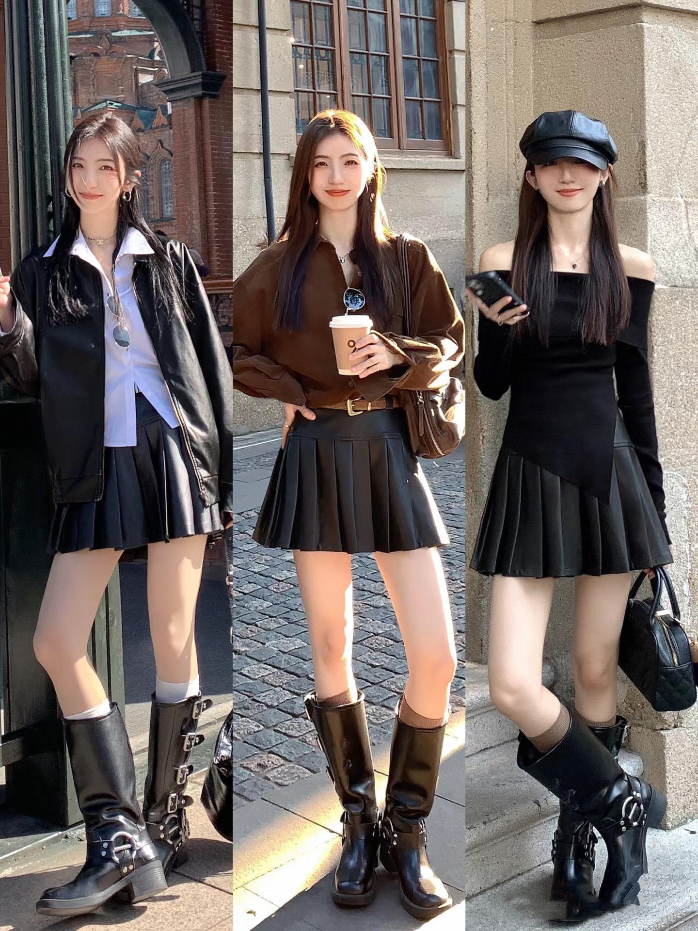我們可以用黑色長靴,來搭配黑色短裙。搭一件皮衣外套,也更凸顯出氣質美。這種酷颯又洋氣的穿搭,也是非常的顯高又養顏。