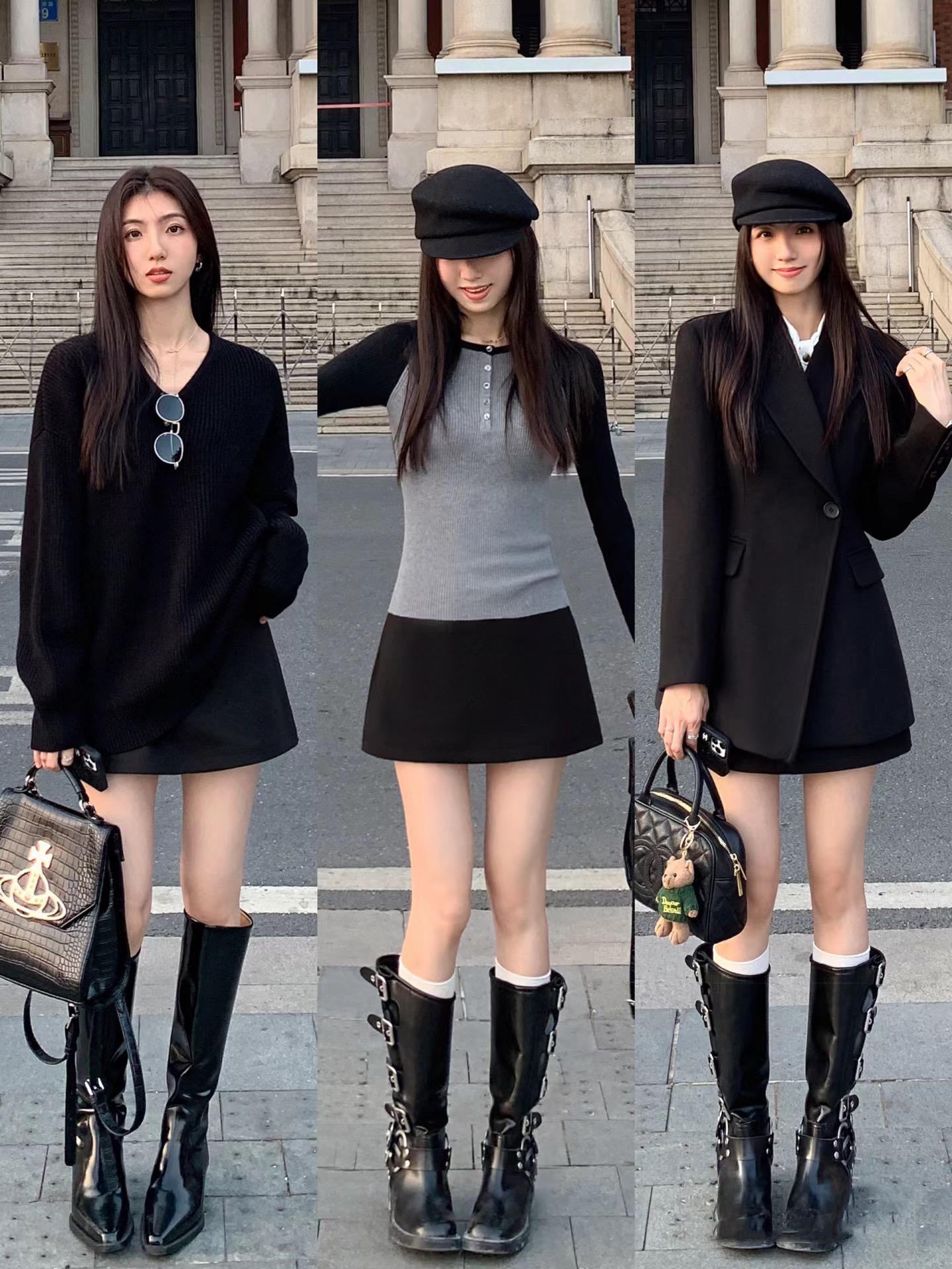 黑色的直筒裙,屬於一種比較百搭又時尚的單品。我們可以穿超短款的小黑裙,配一雙及膝的長靴,整體風格優雅又時尚。